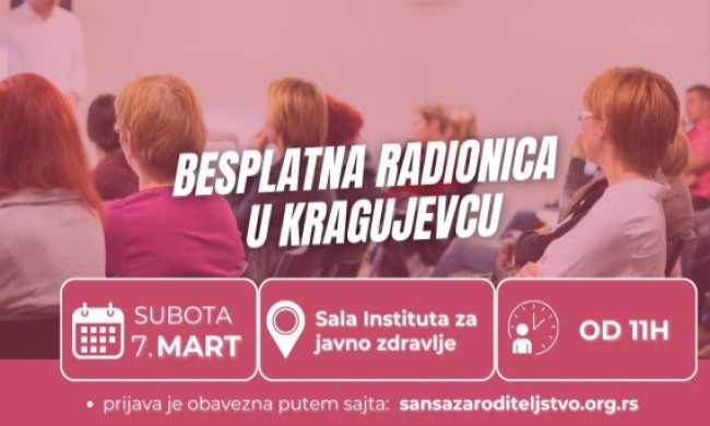 Udruženje Šansa za roditeljstvo poziva sve zainteresovane građane Kragujevca i okoline da prisustvuju besplatnoj radionici, koja će biti održana 7. marta u 11 časova u sali Instituta za javno zdravlje Kragujevac. Radionica se organizuje u okviru Karavana Šanse za roditeljstvo, koji tokom 2026. godine obilazi gradove širom Srbije sa ciljem da pruži pouzdane informacije, stručnu podršku i prostor za otvoren razgovor o izazovima na putu do roditeljstva, kao i o očuvanju reproduktivnog...