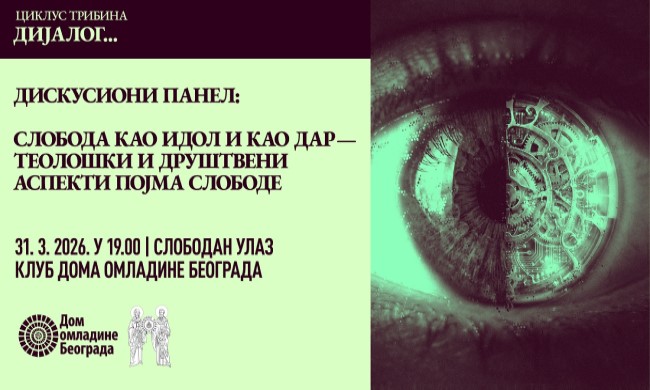 Diskusioni panel „Sloboda kao idol i kao dar – teološki i društveni aspekti pojma slobode“ biće održan u utorak, 31. marta 2026. godine u 19 časova, u Klubu Doma omladine Beograda.