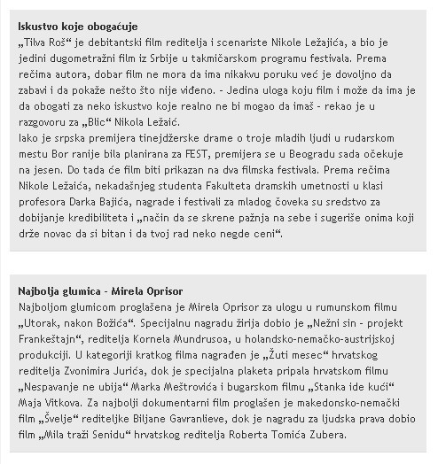Nakon devet dana najvećeg filmskog festivala u regionu, dodelom nagrada zatvoren je 16. „Sarajevo film festival“. Filmski radnici i mnogobrojna publika iz celog sveta mogli su da na devet lokacija pogledaju 201 film svetske i regionalne kinematografije, posete osamnaest koncerata, prisustvuju specijalnim dodatnim filmskim i muzičkim događajima i uživaju >> Pročitaj celu vest na sajtu MC Bor << u gradu koji svojom gostoljubivošću ne ostavlja ravnodušnim goste ni sa istoka, niti sa zapada, piše današnji Blic.