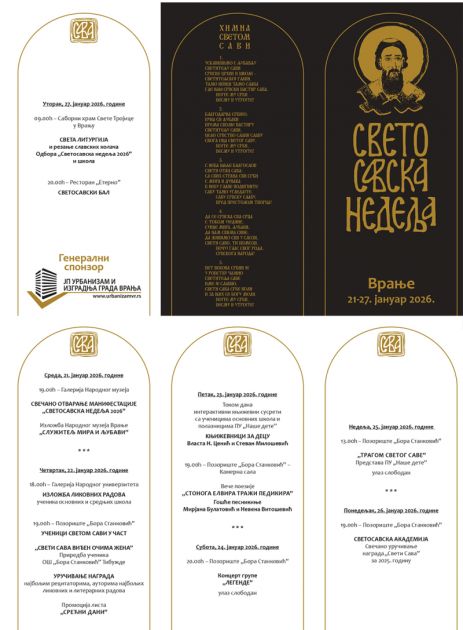 Vranje će od 21. do 27. januara 2026. godine biti domaćin tradicionalne manifestacije „Svetosavska nedelja 2026“, posvećene obeležavanju lika i dela Svetog Save, u organizaciji grada Vranja i ustanova kulture i obrazovanja.