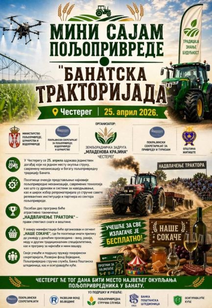 У Честерегу ће у суботу, 25. априла, бити одржан први мини сајам пољопривреде под називом „Банатска тракторијада“, који ће окупити пољопривреднике, стручњаке и љубитеље аграра из читавог региона. Фото: PrtSc/НС Уживо Манифестацију организује Земљорадничка задруга „Младенова крајина“ из Честерега, уз подршку Министарства пољопривреде, шумарства и водопривреде, Покрајинског секретаријата за пољопривреду, водопривреду...