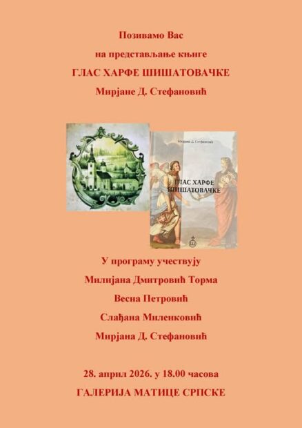 Промоција нове књиге проф. др Мирјане Д. Стефановић “Глас харфе шишатовачке” у уторак, 28. априла у Галерији Матице српске