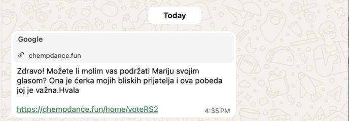 Prevara putem popularne aplikacije na koju je u subotu uveče upozorila policija u Nišu, ne dešava se izgleda samo u ovom gradu na jugu Srbije, već i u Novom Pazaru. Opasna WhatsApp prevara poslednjih dana intenzivno se širi Novim Pazarom i već je odnela značajnu svotu novca od građana koji su, verujući da pomažu prijateljima, postali žrtve digitalnih kriminalaca. Sve počinje porukom koja dolazi sa broja osobe koju poznajete – prijatelja, rođaka ili bliskog poznanika – sa molbom da glasate za devojčicu po imenu Marija, uz objašnjenje da je reč o ćerki prijatelja i da bi joj pobeda mnogo značila. U poruci se nalazi link koji vodi na stranicu sa navodnim glasanjem. Interfejs deluje uverljivo, sa fotografijama dece, dugmetom...