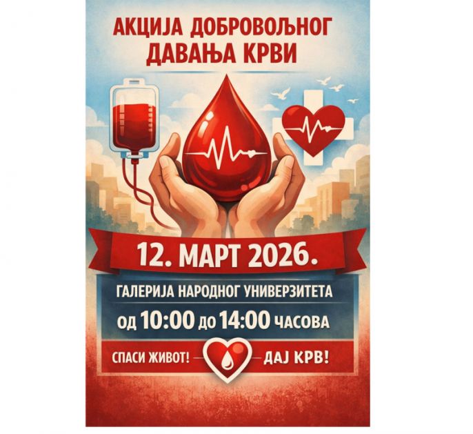 Crveni krst Vranje organizuje akciju dobrovoljnog davanja krvi koja će biti održana u četvrtak, 12. marta 2026. godine, u periodu od 10 do 14 časova. Akcija će se realizovati u Galeriji Narodnog univerziteta u Vranju, na ulazu kod biblioteke. Organizatori pozivaju sve humane građane koji su u mogućnosti da se odazovu i učestvuju u ovoj značajnoj akciji, kako bi pomogli u obezbeđivanju dovoljnih rezervi krvi za one kojima je najpotrebnija. Dobrovoljno davanje krvi predstavlja jedan od najhumanijih gestova, a svaka donirana jedinica može pomoći u lečenju i spasavanju života pacijenata kojima je krv neophodna. Iz Crvenog krsta Vranje poručuju da je svaki davalac...