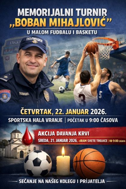 Sindikat srpske policije – Regionalni centar Vranje organizuje memorijalni turnir u malom fudbalu i basketu „Boban Mihajlović“, koji će biti održan u četvrtak, 22. januara 2026. godine, u znak sećanja na prerano preminulog kolegu i izuzetnog policajca. Turnir će se održati u Sportskoj hali u Vranju, sa početkom u 9 časova, a očekuje se učešće brojnih ekipa i kolega iz policijskih jedinica, kao i veliki broj posetilaca koji će svojim prisustvom odati poštu Bobanu Mihajloviću. U okviru obeležavanja ovog memorijala, dan ranije, u sredu 21. januara, biće organizovana i akcija dobrovoljnog davalaštva krvi. Akcija će se održati u hramu Svete Trojice u...